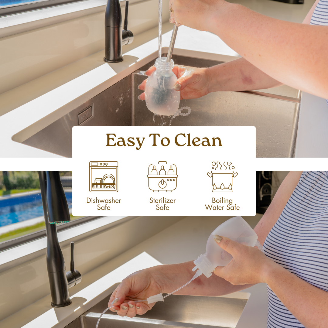 - To rinse the tubing, fill pouch with drinking-quality water and connect the tube. Turn pouch upside down and squeeze the water through the tube. Repeat as necessary until clean. If any water is trapped inside the tubing after cleaning, drain the water from pouch, connect the tube then squeeze to flush it out. Clean tubing as soon as possible after feeding to prevent milk drying inside. It is important all residual moisture dries.