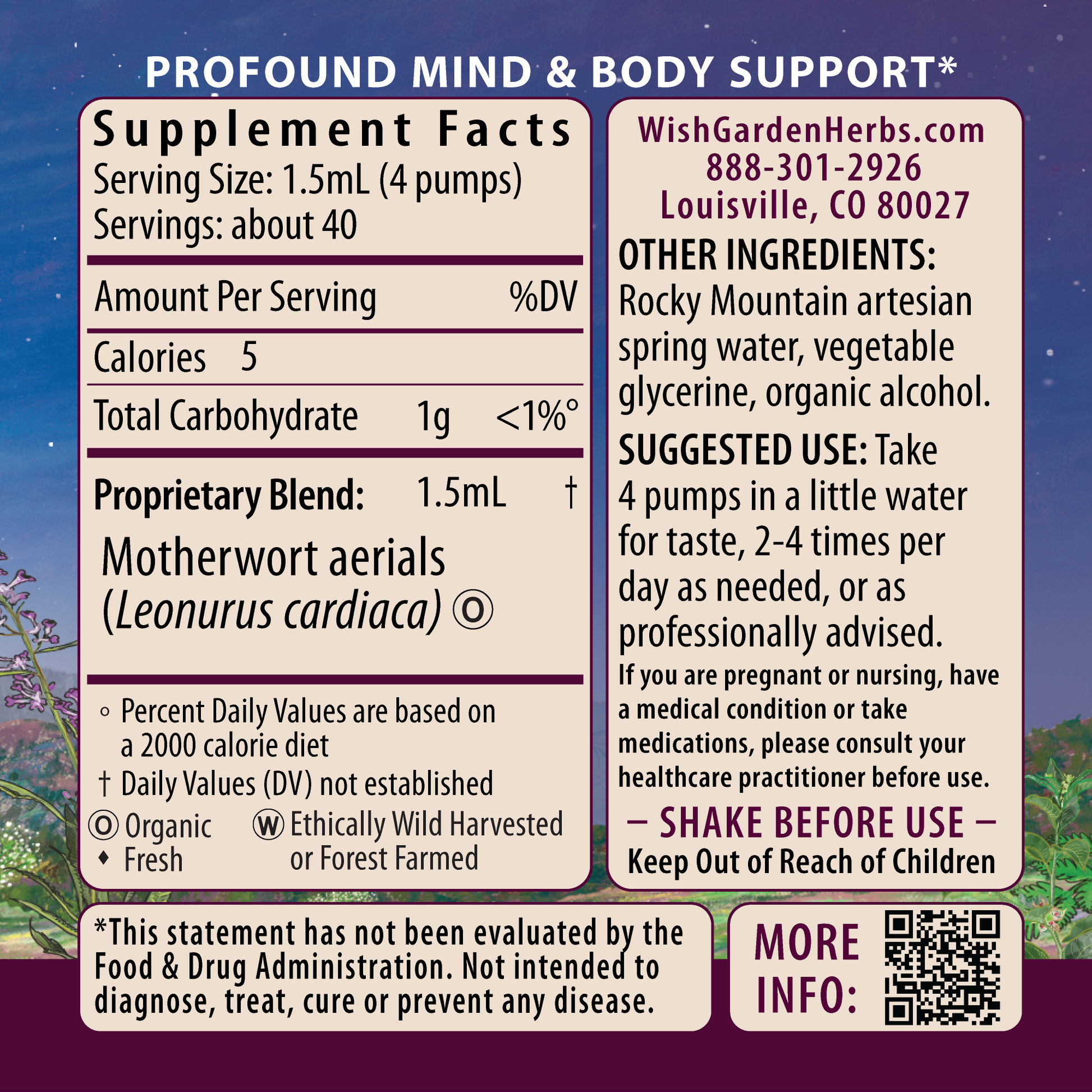 Motherwort aerials (Leonurus cardiaca), Rocky Mountain artesian spring water, vegetable glycerine & organic gluten-free alcohol.
